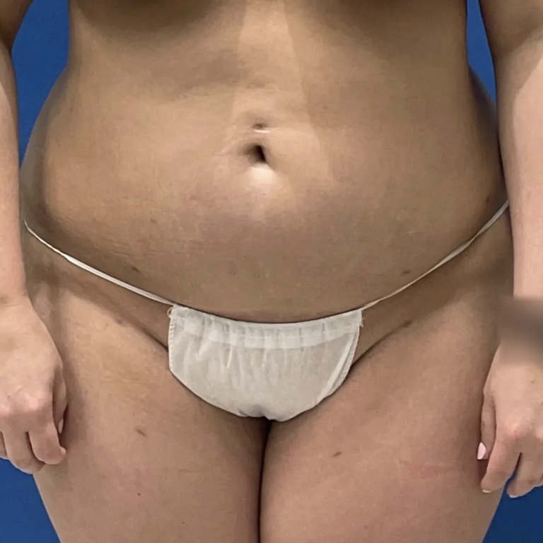 30-year old patient (5'4"/185 lbs) 3 months after liposuction & Renuvion skin tightening of abdomen, flanks, and inner thighs as part of a mommy makeover. Note: skin will further tighten up to 9 months post-op as tissues continue to contract.
