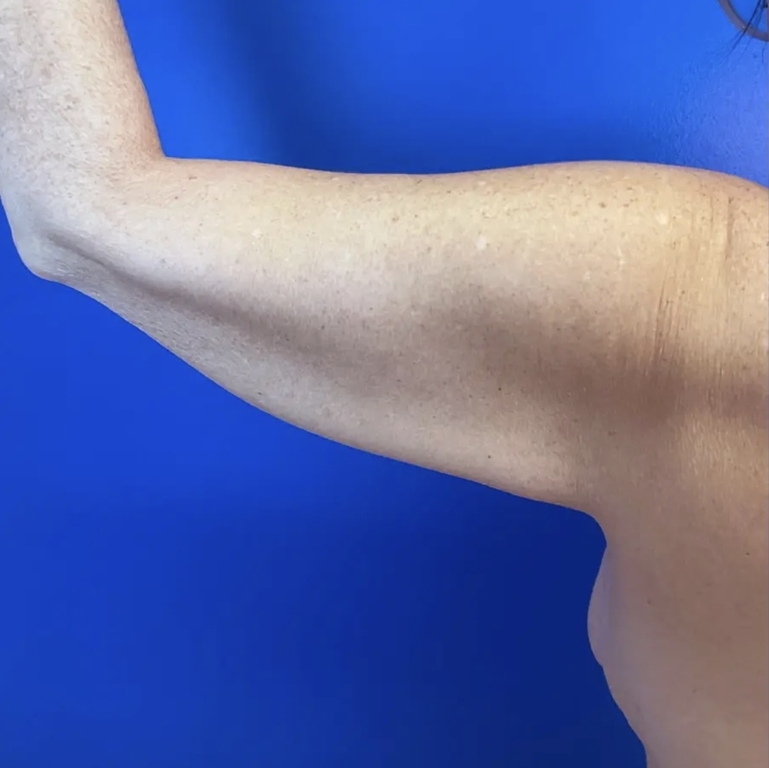 49-year old patient (5'4"/148 lbs) 3 months after non-surgical arm lift using liposuction with Renuvion skin tighening on upper arms. Note: results will improve slightly more for another 3-6 months as skin continues to contract.
