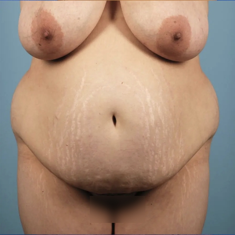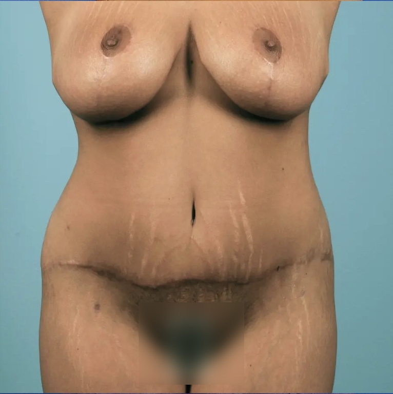 32-year old 160-lb mother of 3 6 months after mommy makeover of tummy tuck, liposuction on abs, back, hips & flanks, and breast reduction (from 38DD cup size). Note: scar is only midway to maturity and will continue to fade with application of silicone scar gel.