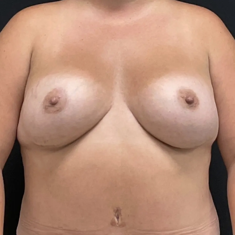 29-year old patient 6 months after breast augmentation w/ high profile silicone implants of 650 cc (R) and 590 cc (L) to enhance volume & symmetry. Patient also had a tummy tuck in a combined mommy makeover surgery.