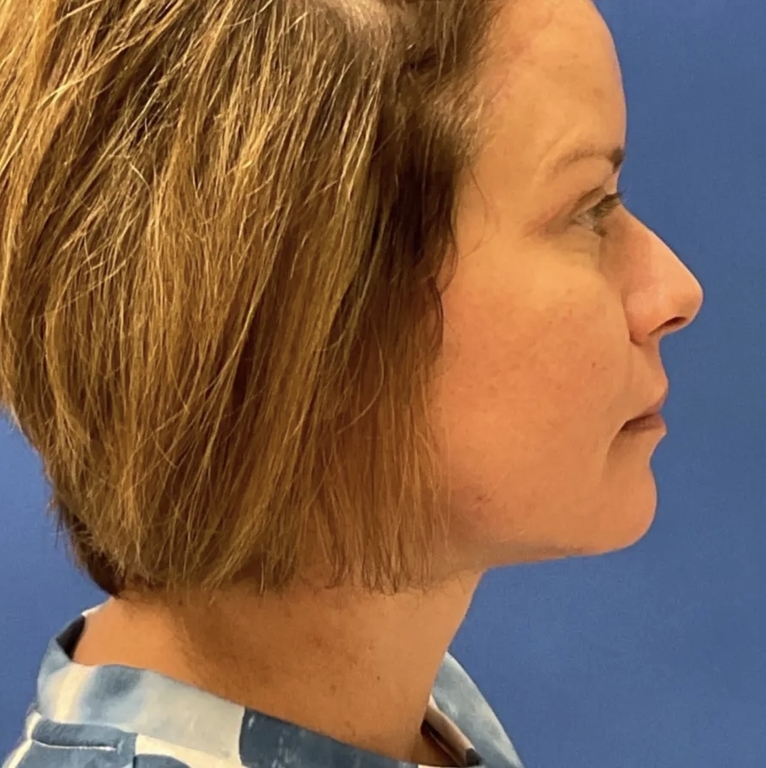 46-year old patient 5 weeks after facelift with brow & upper eyelid lift to rejuvenate jawline and achieve lifted brows and rounder shape of eyes.