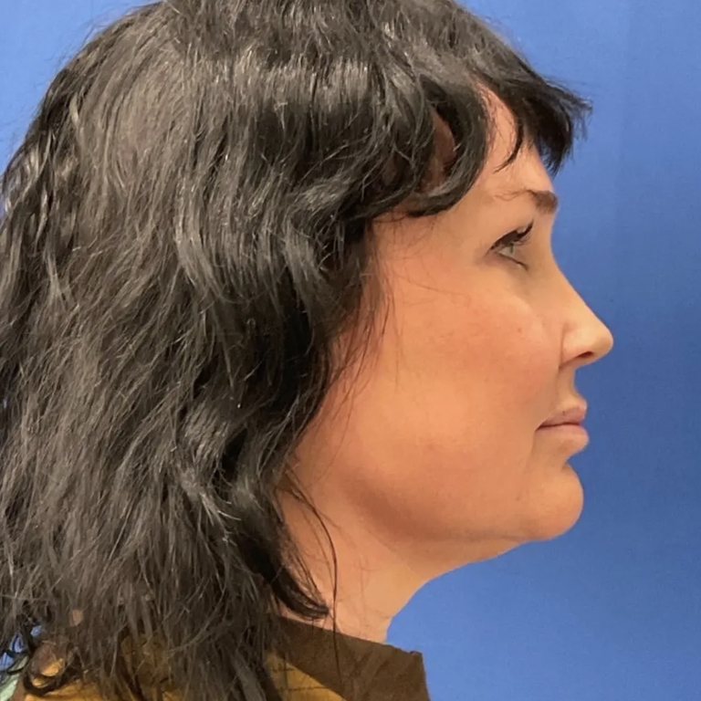 54-year old patient 6 weeks after surgical facelift to lift and tighten sagging skin of the lower face and jawline.